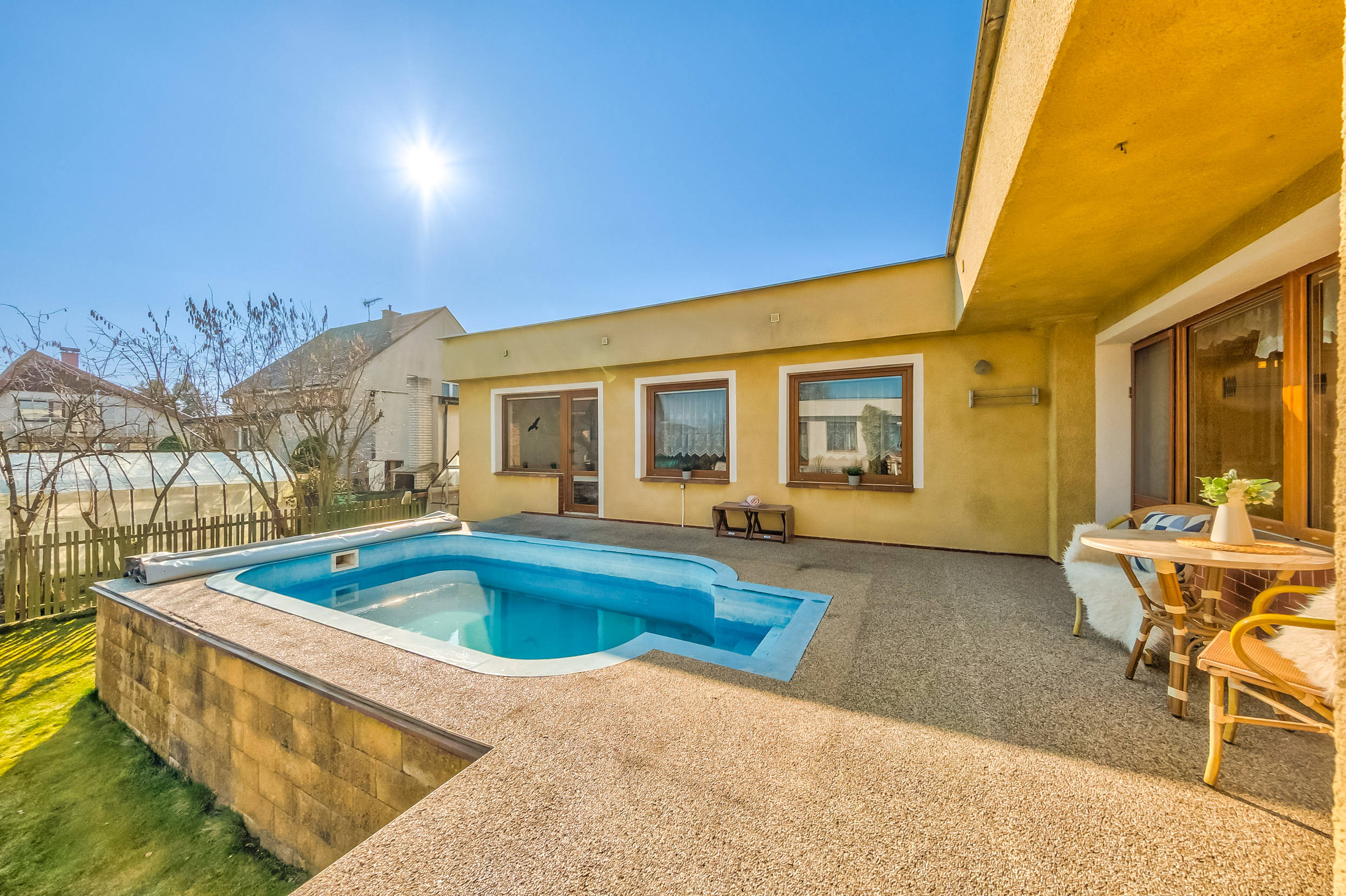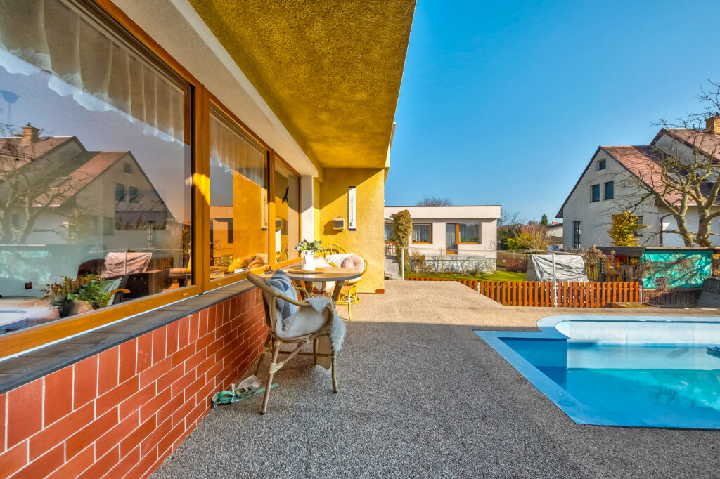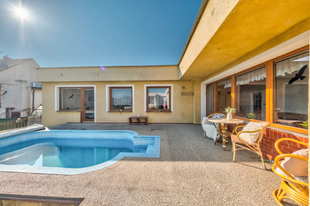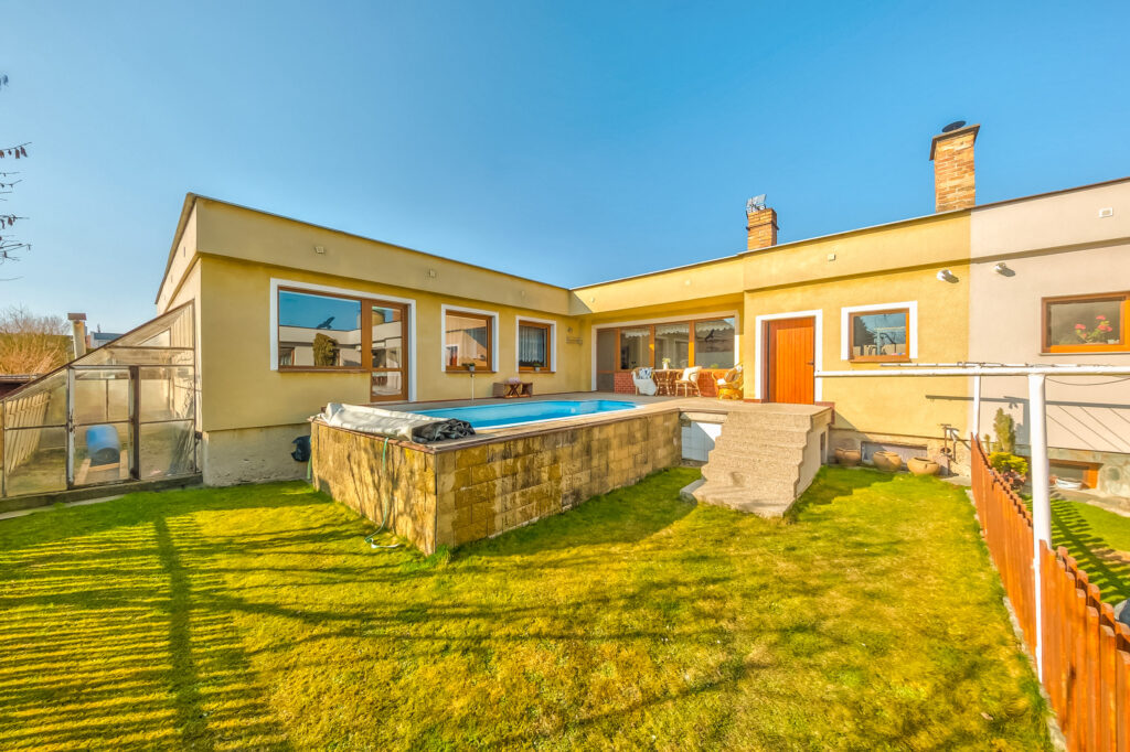 Rodinný dům 4+1, řadový, přízemní, částečně podsklepený, s garáží, zahradou, terasou a bazénem.