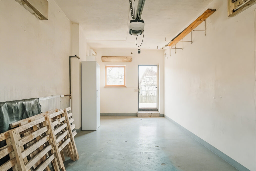 Součástí domu je garáž, která je průchozí z ulice až na zahradu. Z garáže se navíc dostanete přímo do sklepa nebo do kuchyně. Po zaparkování tak můžete nákup pohodlně vynést rovnou do domu.