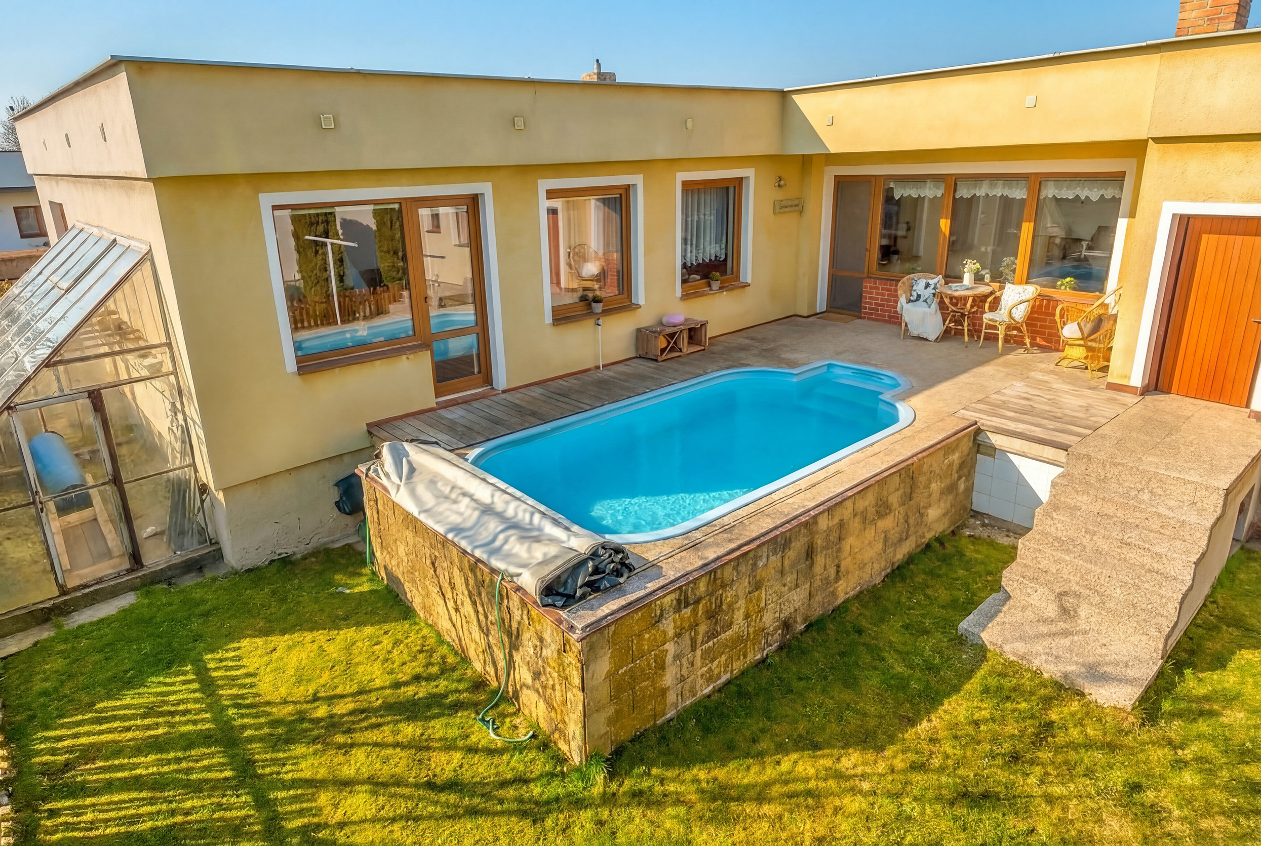 Na zahradě se nachází terasa s bazénem a také skleník.