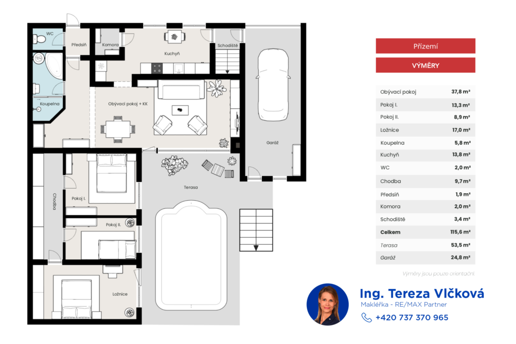 Užitná plocha obytné části je cca 115 m², garáž má téměř 25 m².