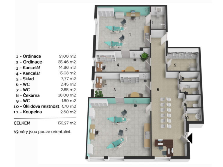 Prostor se skládá ze čtyř místností a velké vstupní haly. Součástí prostoru je i samostatné sociální zázemí. Technická místnost se sprchovým koutem může zároveň sloužit jako denní zázemí pro personál. V prostorné hale lze umístit recepci a čekárnu, zadní místnost má vlastní sprchový kout. Dvě a dvě místnosti jsou aktuálně připraveny jako průchozí. Ve fotogalerii je k dispozici zpracovaný půdorys s návrhem možného řešení a využití.